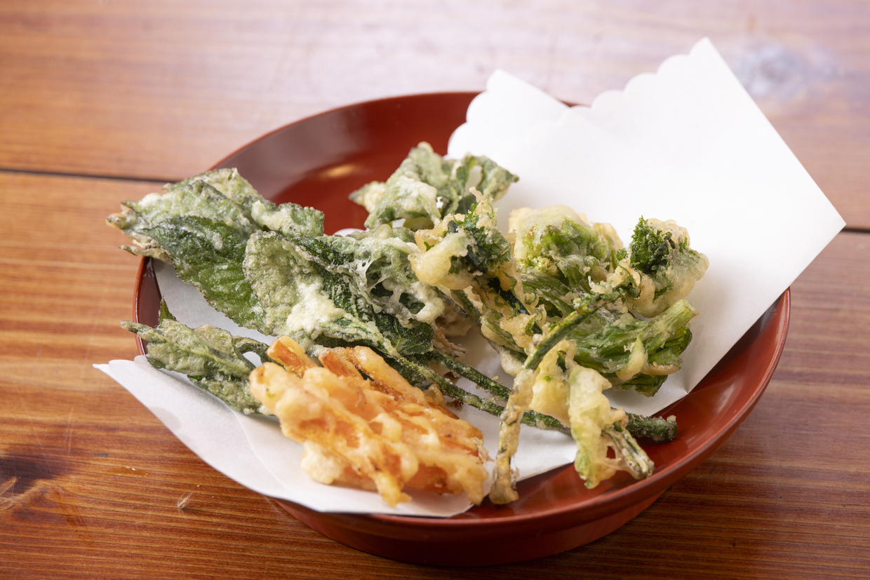 ・山菜天ぷら盛り合わせ 500円(税込) 採れたての山菜をカラッと軽やかに揚げた、季節の味覚を楽しめる一品です。ほろ苦さと豊かな香りが引き立ち、素材本来の風味を存分に味わえます。定食にもう一品添えたいときにもおすすめです。