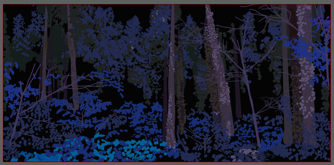 An essay describing these emotional states is applied to the window using cutting sheet lettering, while a painting recreating the nighttime forest of Tokamachi—measuring 3 meters wide by 1.5 meters high—is installed alongside it.Through experiences unimaginable in the city, the artist explores the fragility of the worldview she has formed over her life, expressing this theme through both painting and essay. (Artist’s statement)