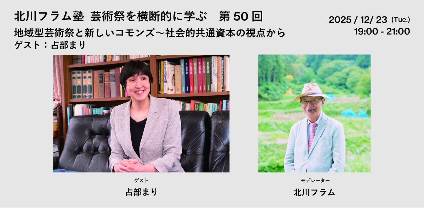 第50回を迎える北川フラム塾では、医師であり故・宇沢弘文氏の長女である占部まりさんをお招きします。ご自身の経験を通して、地域型芸術祭についてお話しいただきます。