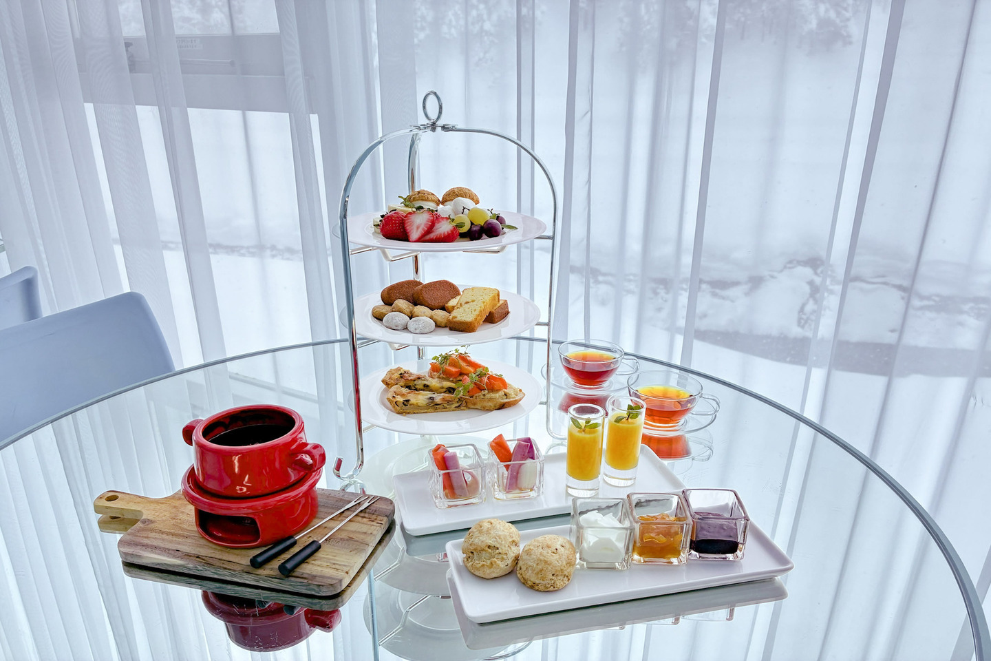 現代アートの作品空間で地元産の食材を楽しめる「越後まつだい里山食堂」で、期間限定のアフタヌーンティーを開催します。自家製ケーキや焼き菓子に加え、今季限定のチョコレートフォンデュが登場。甘いものから軽食まで揃った、大満足のメニューをご用意しました。特別な空間で、ゆったりとした午後のひとときをお過ごしください。