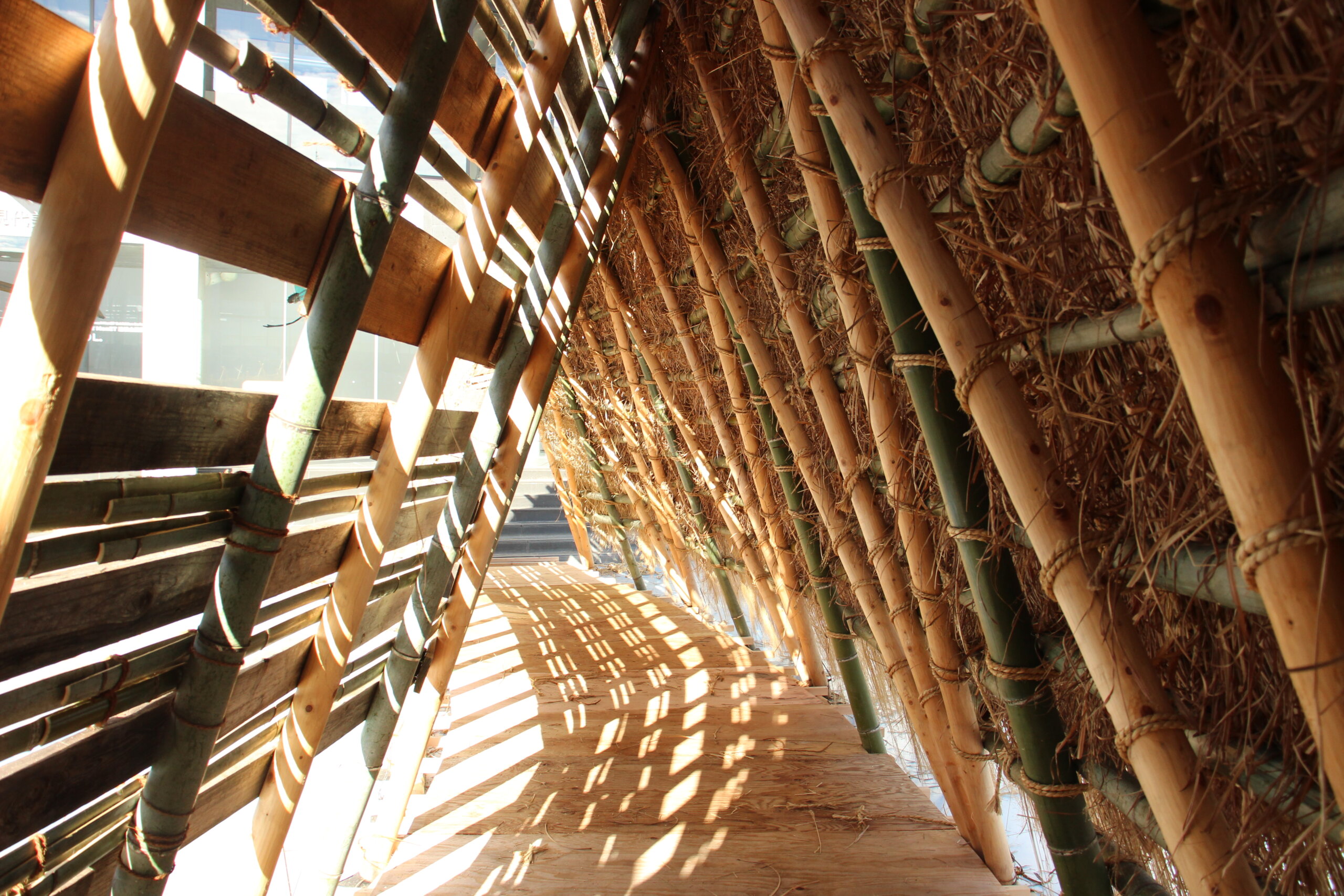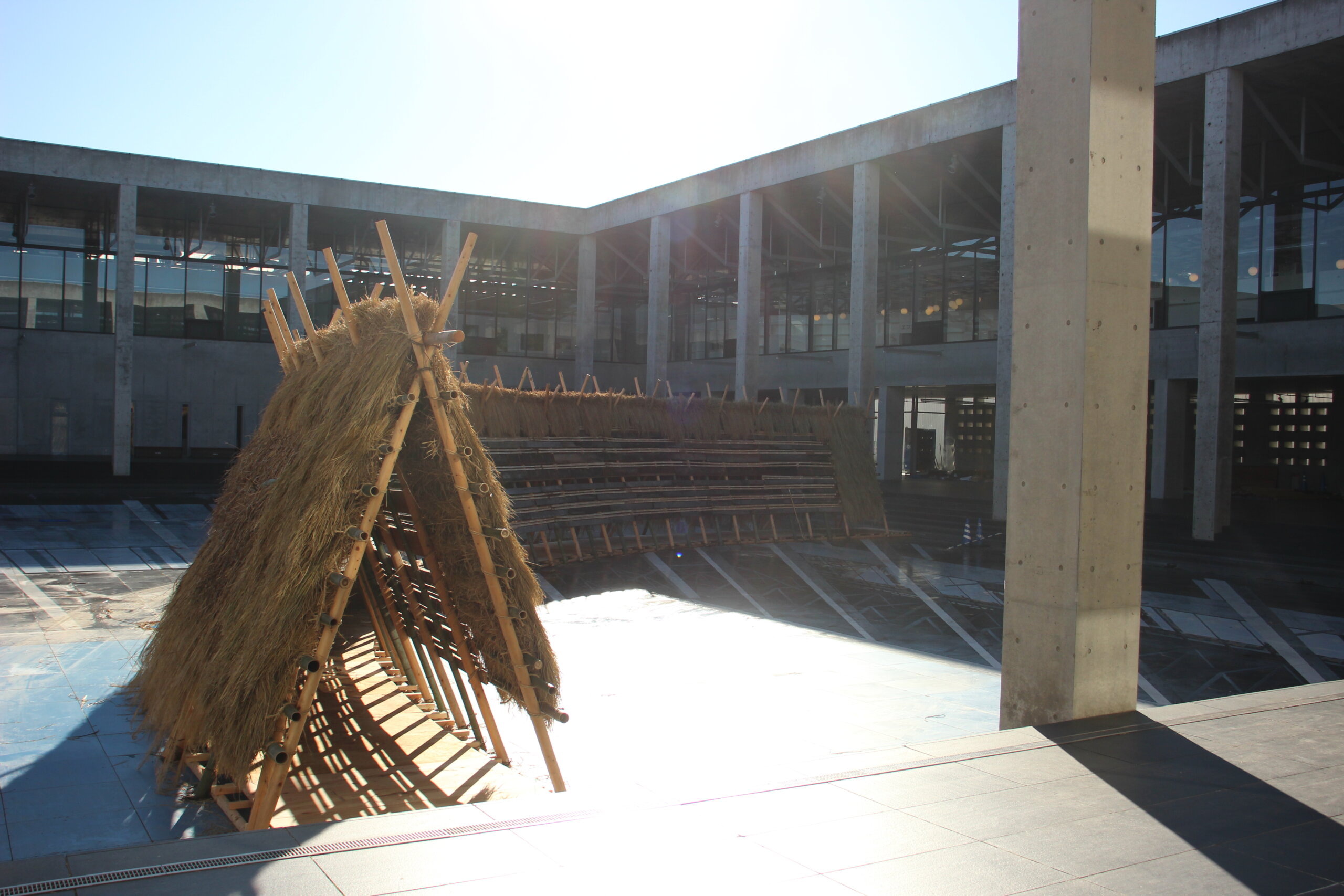 十日町の人々の暮らしは毎年やってくる大雪と共にある。雪に備えて仮設的につくられる雪囲いや雪棚を参照し、茅や稲藁、サルベージした木材を用いたトンネルと雪用民具のツールシェッドを制作した。建築家原広司が「地球を見るための孔(あな)」と表現したMonETの中庭は、雪が降り積もるにつれて民俗誌的な雪庭へと変わり、回廊をつなぐもう一つの孔が現れる。そんな想像を膨らませながら、雪を待つ。