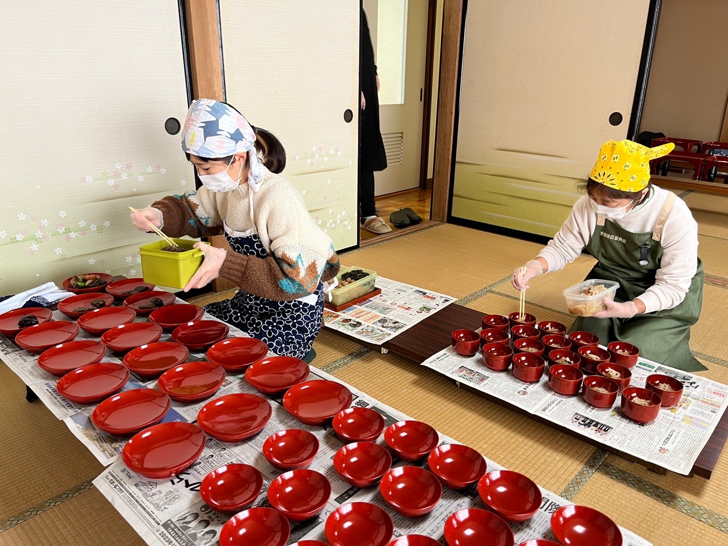 芸術祭を機に繋がりができた集落のお母さんたちと、冬の風物詩「雪見御膳」の準備。