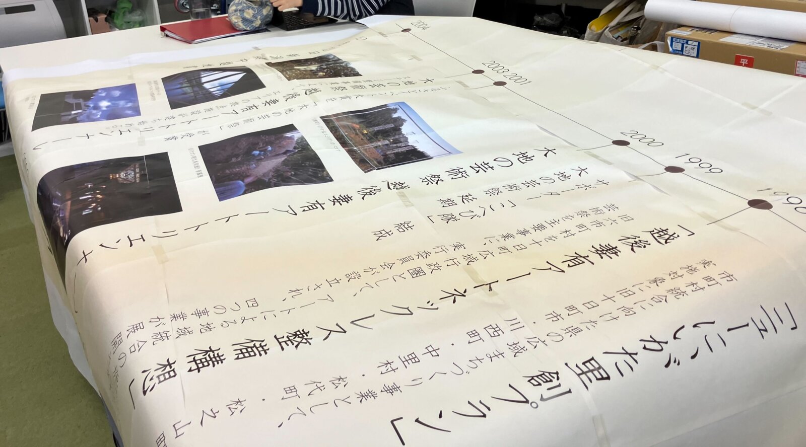 第9回展の企画発表会でこれまでの芸術祭の活動をたどる年表があると面白いなと思い、大きな芸術祭年譜をデザイン。写真はその試作。