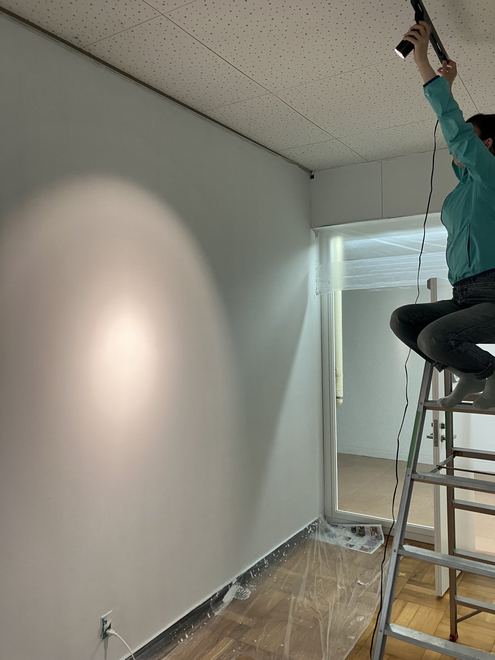 【作品制作業務】 担当するアーティストの作品を展示するために、教室を塗装したり、ライティングの調整。