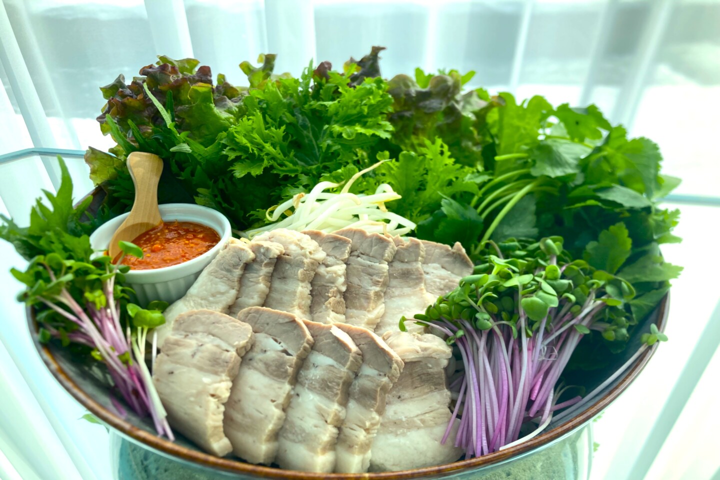 越後妻有のブランド豚「妻有ポーク」をスパイスや香味野菜と共にじっくりと茹で上げました。里山食堂特製の辛味噌とともにジューシーなお肉を新鮮野菜で包んでお召し上がりください。お野菜を美味しくたくさん食べられるメイン料理です。※お肉は真空パックでのお渡しとなります。ご宿泊先で湯せんをしてお召し上がりください。