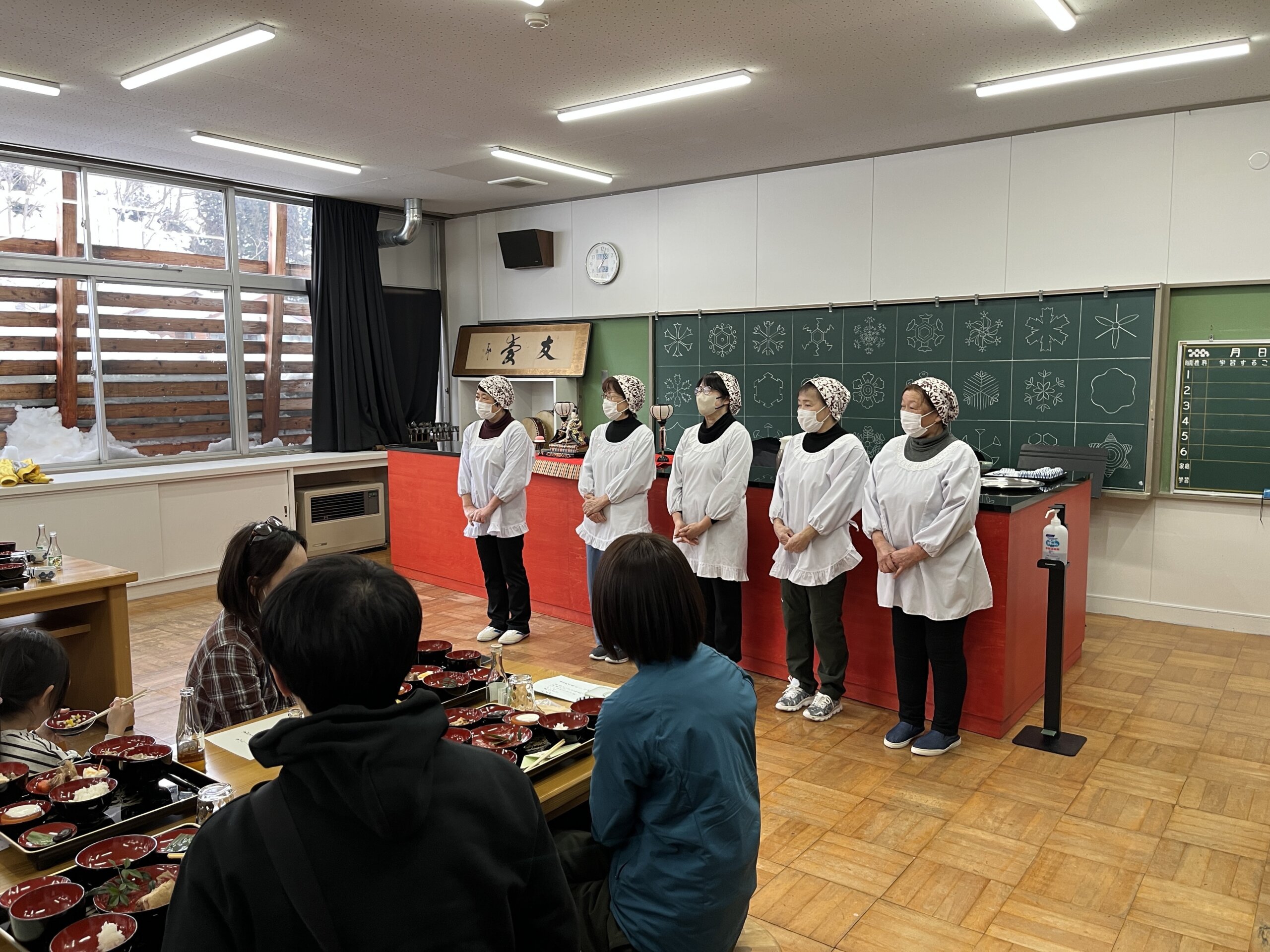 小正月行事「鳥追い」の後の雪見膳は、築70年の木造校舎の宿「三省ハウス」の団子の木で飾られた食堂で、揃ってお楽しみいただきます。地元とサポーター、スタッフみんなでつくる小正月ツアーの雪見御膳です。