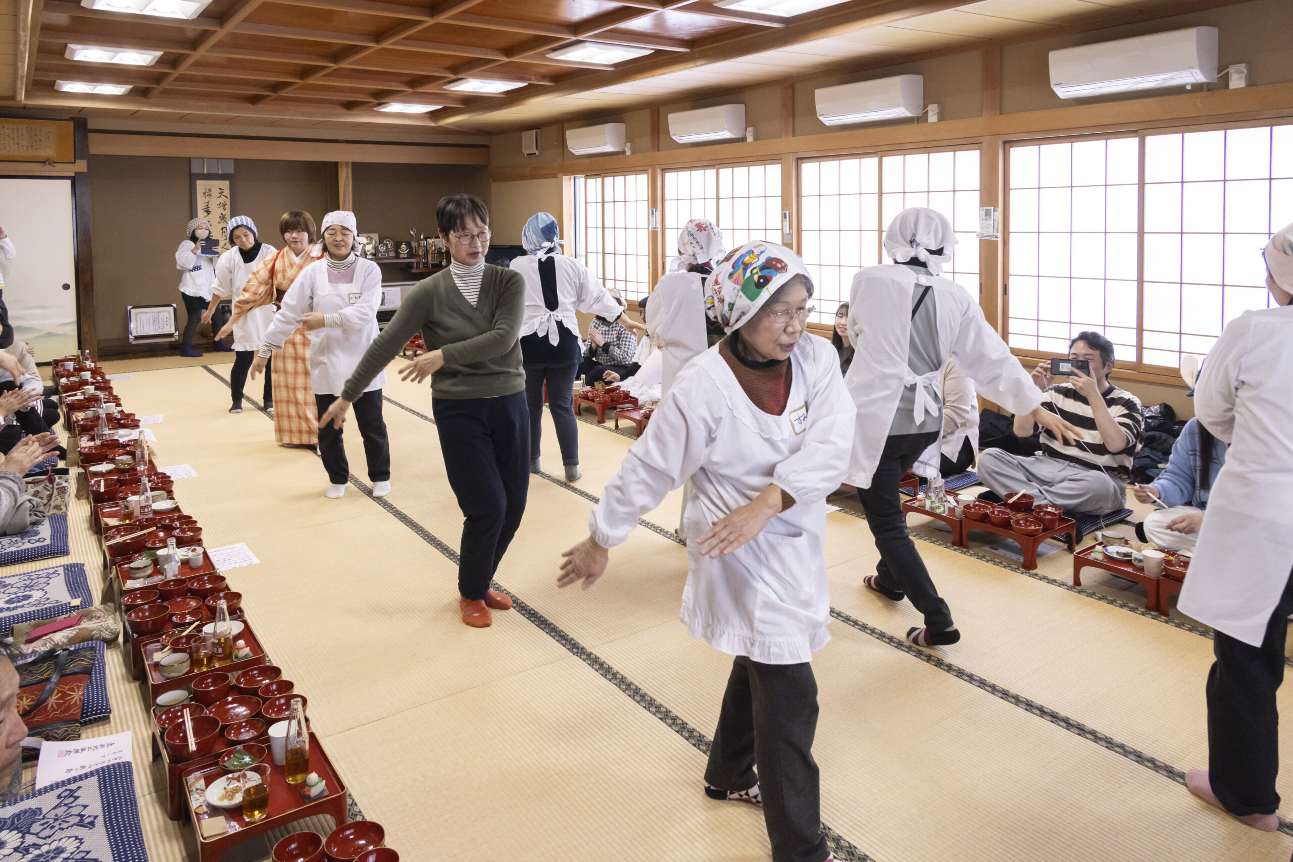 上新田は、縄文時代から人々の営みが続く歴史深い地域です。野首遺跡や国宝・笹山遺跡に並ぶ土器がここからも発見されており、今も地中には未発掘の遺物が眠っているともいわれています。また、大正時代に上州の菓子職人が踊りを伝えたことから、上新田独自の「八木節」が受け継がれてきました。雪見御膳では、元気なお母さん・お父さんがその踊りを披露してくれるのも見どころのひとつです。